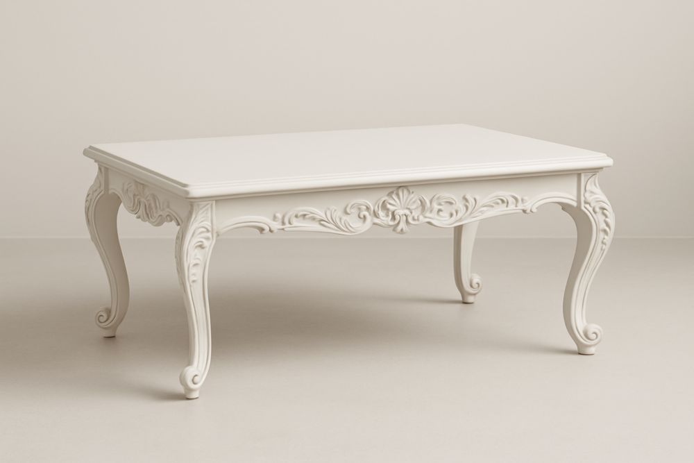 Table basse bois massif blanc sculptée 120x60x45 cm